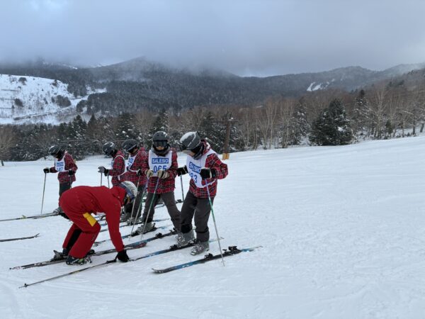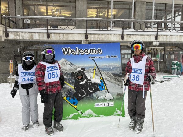 食後は新雪が降る中、開講式を経てスキーレッスンへ。半数は初心者ですが、親しみやすいインストラクターの皆さんの指導を受けてスキーの楽しさを味わえたようです。明日から本格的な講習があり、午後は楽しみな自由滑走もあります。