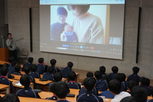 1週目は、本校教員がそれぞれの立場から出産にまつわる経験談を語りました。なかでも一番盛り上がったのは、育児休暇中の教員とオンラインでつながった場面です。ご自宅から、奥様と生まれたばかりのお子様とともにご登場いただき、奥様からは妊娠中のご苦労や出産を迎えるまでの思いを率直にお話しいただきました。