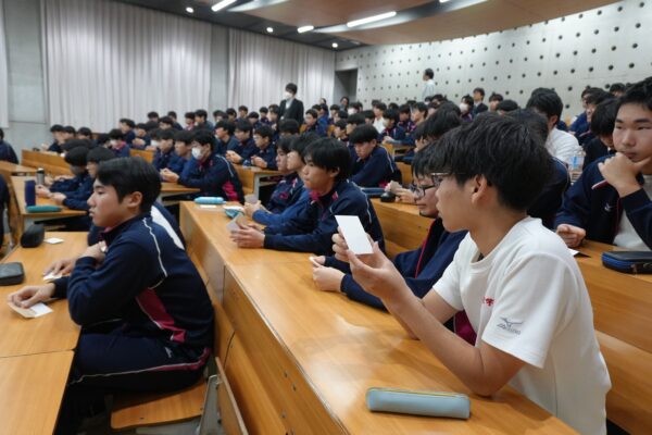 講演中、生徒一人ひとりに配られたカードには、針で小さな穴が一つあけられていました。その大きさは受精卵とほぼ同じだそうです。その穴から、自分たちがこの世に生まれてきた確率の奇跡を思い、言葉では表しきれない命の尊さを感じる時間となりました。