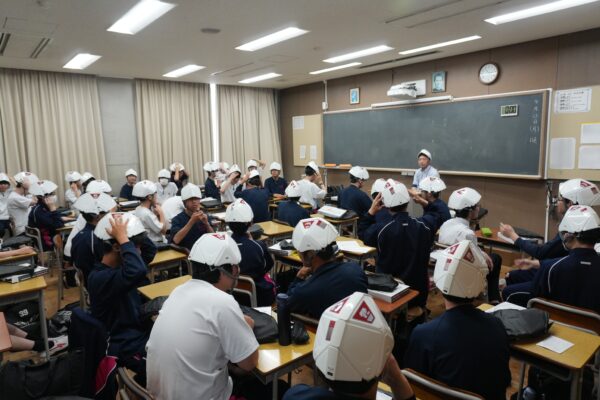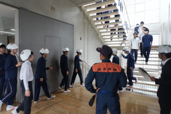 その後、「地震の後に理科室から出火」という想定で避難訓練を行いました。備え付けのヘルメットを実際にかぶり、約7分でグラウンドに集まることができました。