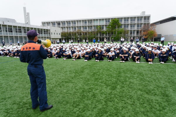 また、避難訓練には、都筑消防署 北山田消防出張の石田所長にお越しいただき、ご指導をいただきました。ご講話の中で、校舎の目の前に広い人工芝のグラウンドがある本校を「恵まれた環境」であるとご指摘いただきました。いざという時にこの環境を活かし、すみやかに安全に行動できるよう、一年に一度の避難訓練の内容をしっかり覚えておきましょう。